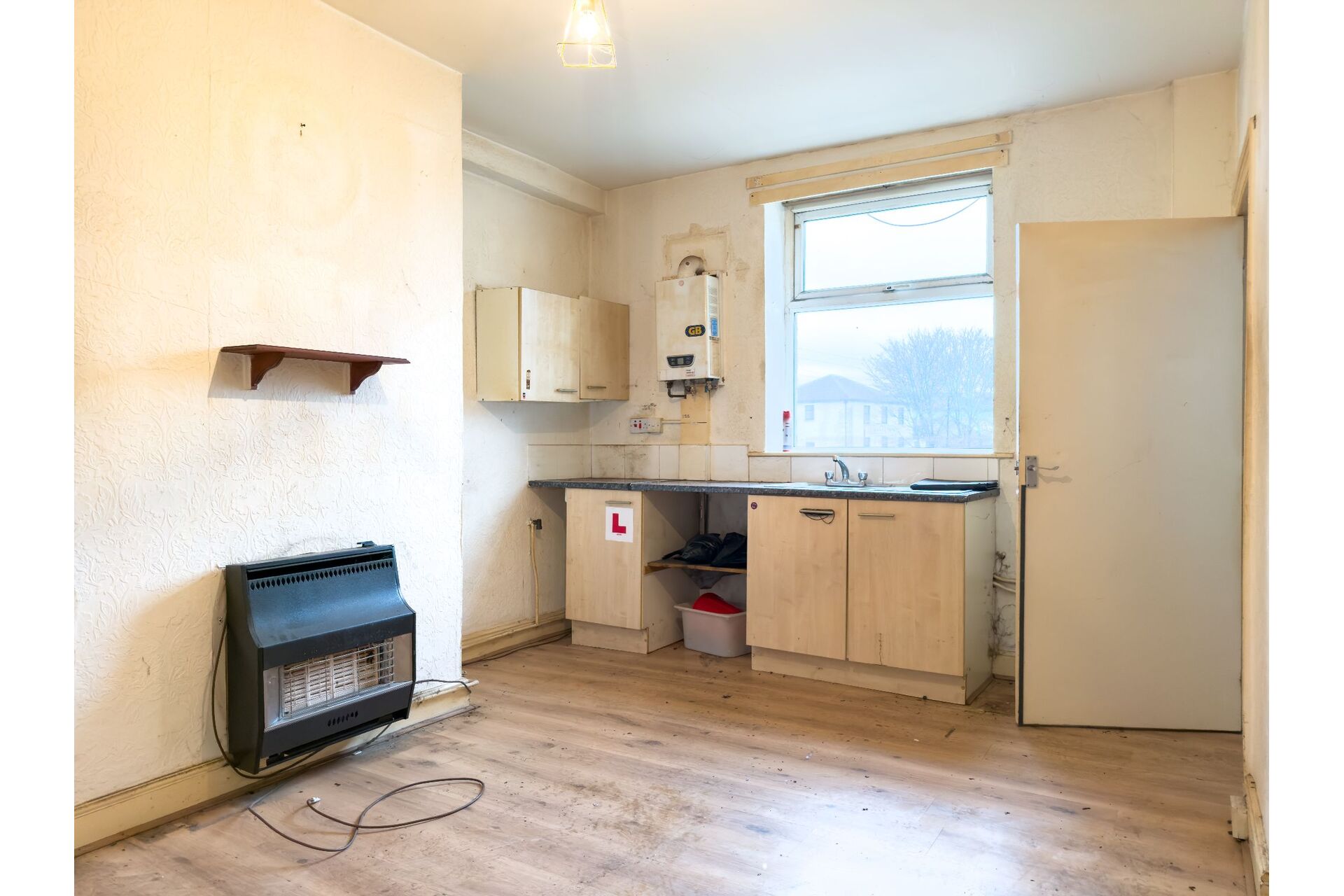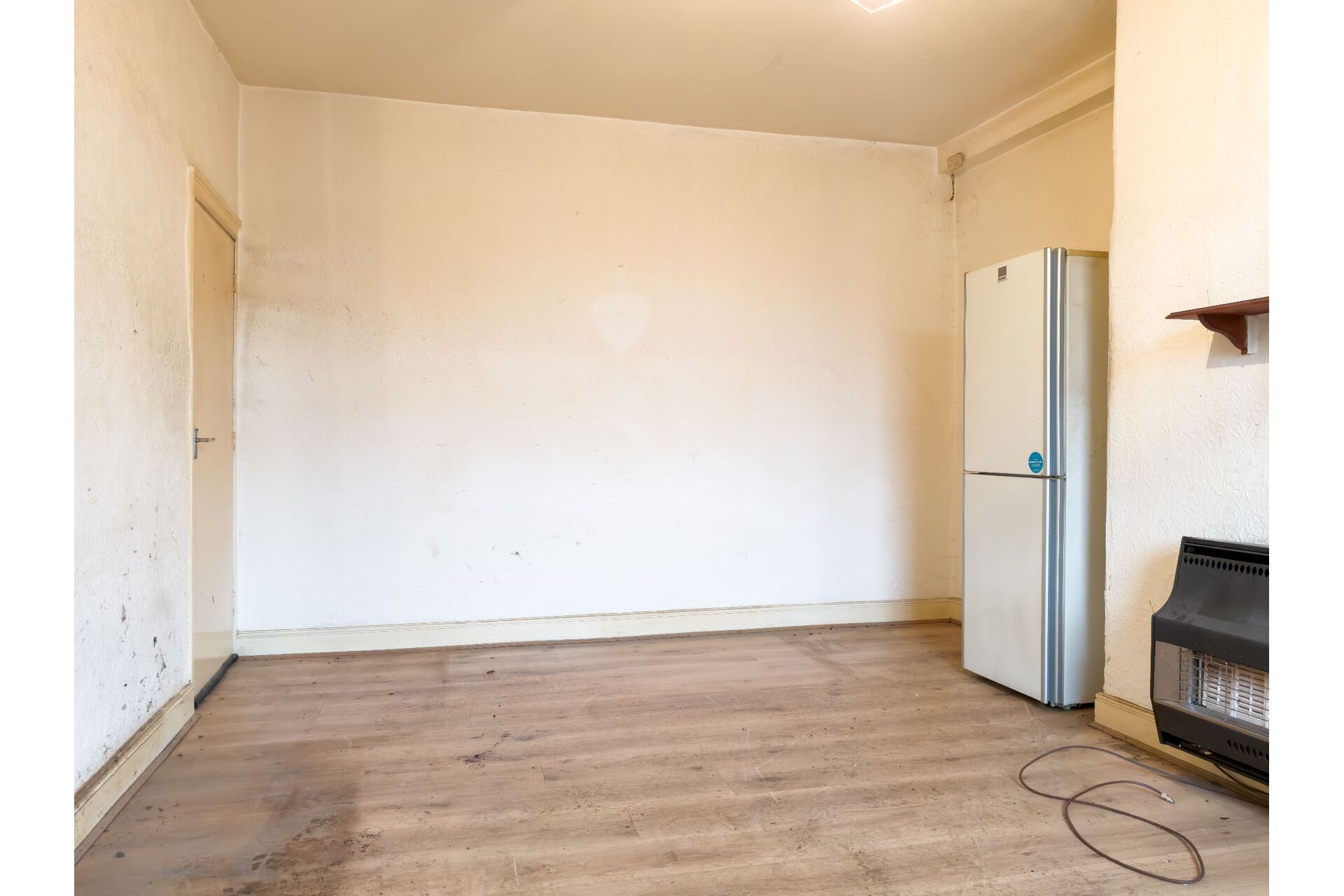The kitchen area is located to the front of the room with both wall and base units and a laminate work top. There is plumbing for a washing machine. Wall mounted hotwater boiler (untested) Front aspect double glazed window. The lounge area has an independent gas fire. (untested) A doo provides access to the cellar.