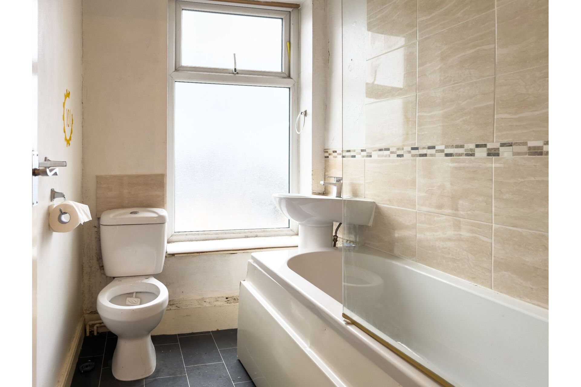 Incoprorating a three piece suite to inlcude a panelled bath with a mixer tap shower over and a glass side screen. Pedistal wash basin and a close coupled toilet. Wall tiles to the splash areas. Double glazed window.