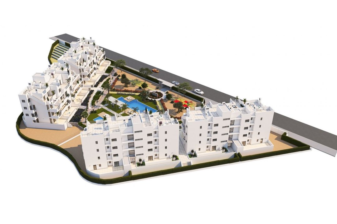 NEW BUILD RESIDENTIAL IN PRIVATE GATED RESORT IN PROVINCE OF MURCIA New Build residential complex has 60 apartments distributed in 4 blocks with terraced area for ground, first and second floors, community swimming pool, heated swimming pool and solarium with Summer kitchen on the penthouses, to enjoy all hours of sunshine every day of the year. The properties have 2 bedrooms and 2 bathrooms as well as parking space and storage room in the basement. These homes are designed with a contemporary style and open planned concept, comprising a fully-fitted kitchen and lounge-dining room. The properties will meet the highest standards and included: Kitchen completely furnished and equipped with oven and microwave in column, integrated fridge and dishwasher, induction hob and extractor fan. LED Lighting: inside the property (dining room, kitchen, corridors and bathrooms), and as well as in outdoor areas. Lined wardrobes with drawers. Motorised blinds in bedrooms. Heated floors in bathrooms. Fully fitted bathrooms with toilet, vanity unit, mirror, shower with rain effect and screen panels. Pre-installation for ducted air conditioning. Pre-installation of charging point for electric vehicles. Solarium with Summer kitchen, with pre-installation for electric appliances. Community swimming pool. Heated swimming pool. Parking space and storage room in the basement. Located in a private gated resort, with a main access entrance and 24 hours security. The resort is designed around an impressive 126.000 m2 green area. It comprises walking and cycling paths, sport facilities, paddle and tennis courts, a mini-golf course, gardens, dog parks, leisure areas, clubhouse. Also in the central area is the jewel of the resort, a crystal-clear artificial lake of almost 17.000m2 of water surface, surrounded by white sandy beaches and palm trees, bringing a piece of the Caribbean to the Murcia Region. There are 2 islands in the lake, one of them has its own bar, there are also beach Chiringuitos spread around the lake. The resort is strategically located less than 4 km from the beach and the town of Los Alczares, where you can practice various water sports, surrounded by several golf courses and the city of Cartagena less than 15 minutes by car and 22 km from Murcia airport, therefore having a wide cultural, gastronomic and sports offer within reach.