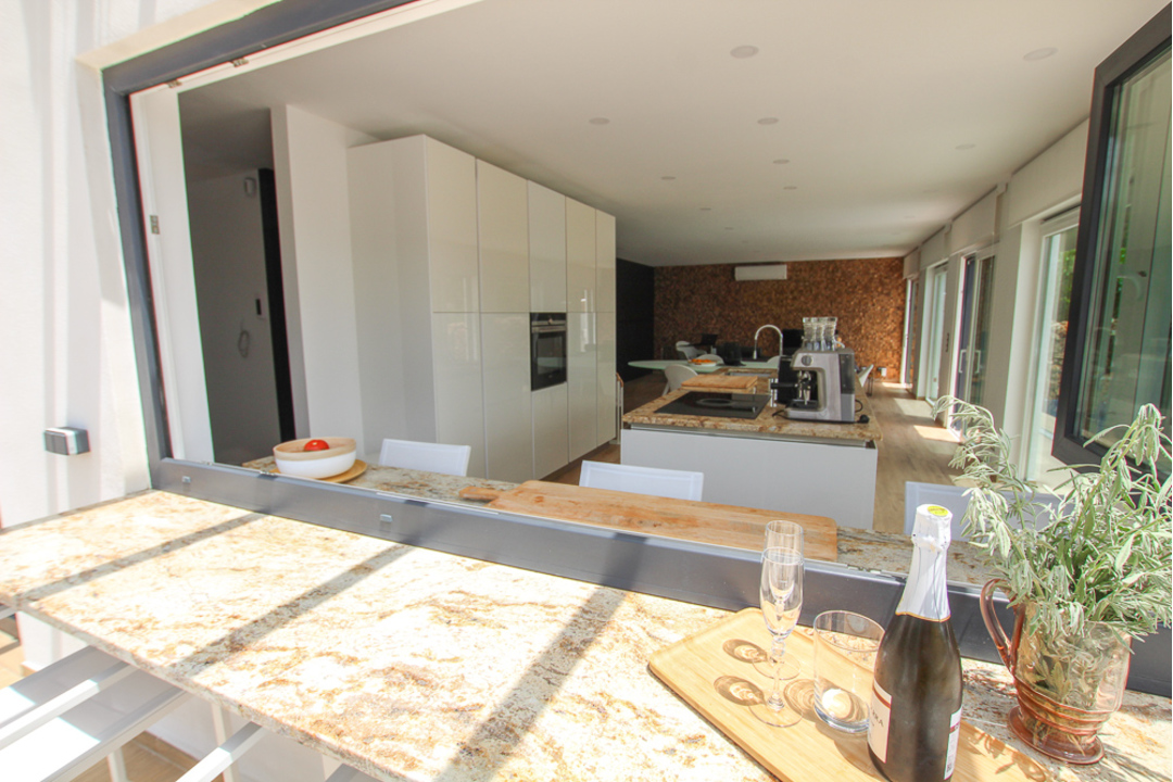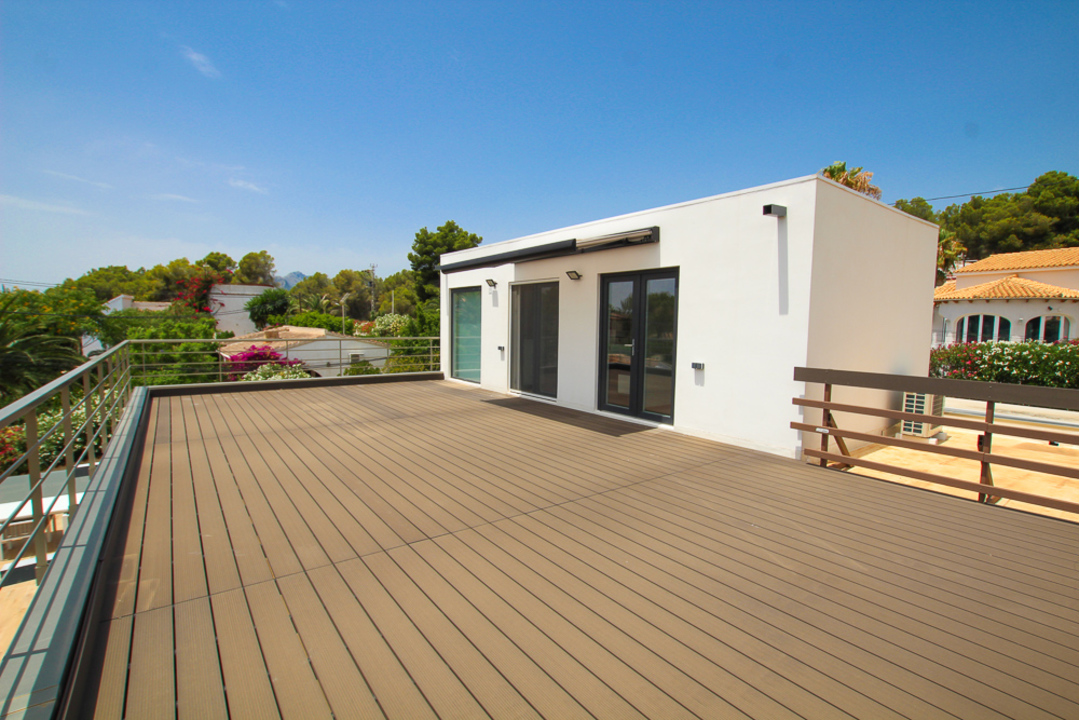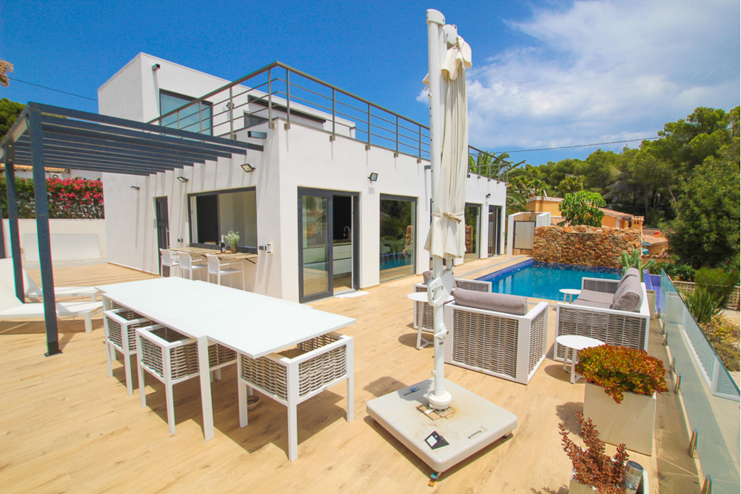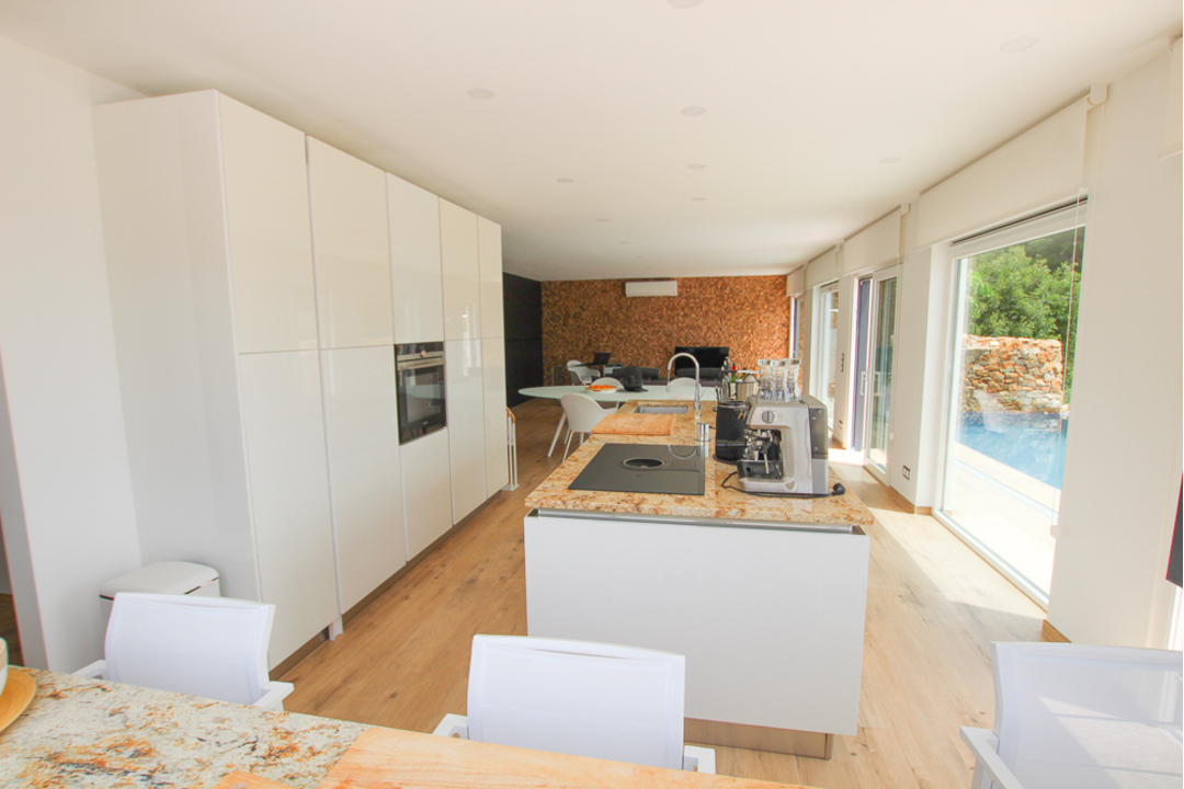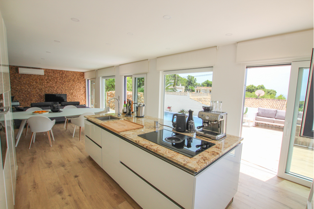 Impressive new build villa in La Fustera, close to Moraira, Benissa and Calpe. Built with many outstanding new technologies, this villa has to be viewed to fully appreciate them all. On entering into the open plan kitchen and lounge, the area is beautifully appointed. There is a white island with sink and hob and all other appliances are integrated behind white, sleek units. Large windows open out to form a unique dining area integrating the kitchen and the terrace. In the lounge/dining area there is a full wall of black oak panels, concealing cupboards and also 2 doors behind which are identical double bedrooms with en-suite showers. Up a flight of steps made of natural wood is the master bedroom with a large en-suite shower room. There are windows leading out to a massive terrace with electric toldo. Here there are great sea views. Outside there is an impressive infinity pool with fountain stone work and well-designed garden and terrace area. There is a large underbuild for garage space or which could easily be converted into more living space. This villa has been designed using up to the minute, eco-friendly technology with acoustic sound insulation, floor and roof insulation, triple glazed windows and has many more special features.