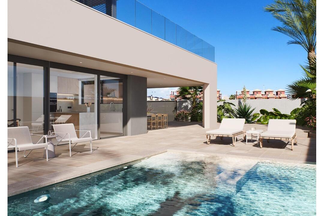 NEW BUILD VILLA IN TORRE DE LA HORADADA Modern New Build villa near Higuericas beach in Torre de la Horadada. The villa consists of a plot of 618 m, with 344 m constructed. Villa has 5 bedrooms: two of them with complete bathroom and dressing room. Kitchen furnished with top quality materials to be chosen by the owner, including electrical appliances, following an open concept with the dining room surrounded by large windows that provide throughout the day a pleasant light and direct access to the pool and private garden areas completely finished. Air conditioning (hot/cold) by ducts included. Taking care to the smallest detail in the finishes, using the highest quality materials, personalized design and luxury without forgetting the maximum comfort, we achieve the enjoyment of housing both in summer and in the mild winter, making it habitable throughout the year. In addition to a covered garage area for 2 vehicles and parking for another car. Villa located 100m from the Higuericas beach, in Torre de la Horadada, a paradise in all aspects, where you can enjoy the immensity of the Mediterranean Sea, the promenade, refreshing swims in the sea, water sports, sailing, surfing, snorkelling and just 8 km from Lo Romero Golf, one of the 21 golf courses on the Costa Blanca. 5 minutes from the marina of La Torre de la Horadada and 10 minutes from the marinas of San Pedro del Pinatar, and the best restaurants where you can enjoy the best Mediterranean cuisine. Not forgetting the proximity of the AP7 motorway that connects our residential with two airports with international destinations, 44 km from Corvera and 75km from El Altet, Alicante. The nearest town to the area where the development is located is Pilar de la Horadada, 1 km away, a quiet town with all kinds of services, schools, health centres, police, pharmacies, etc. There are also two commercial areas nearby, the Dos Mares Shopping Centre in San Javier, a 5 minute drive away and La Zenia Boulevard in Orihuela Costa, a 15 minute drive away.
