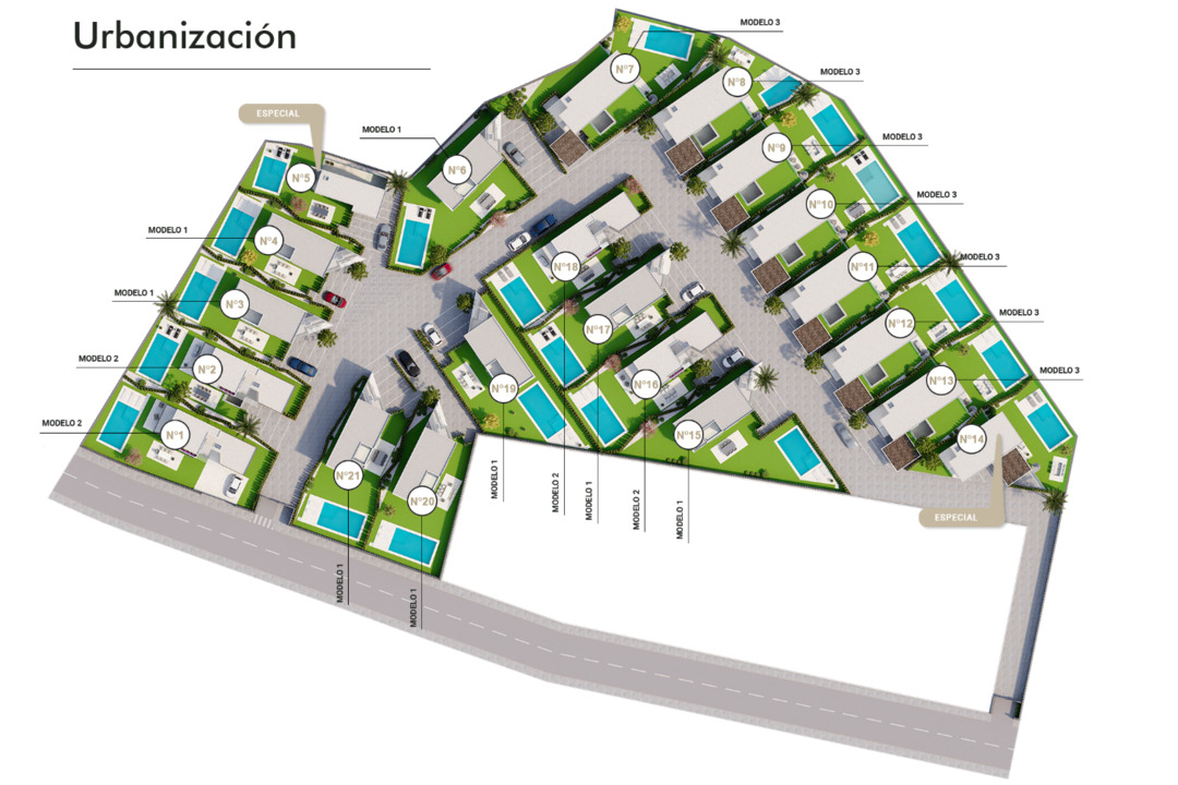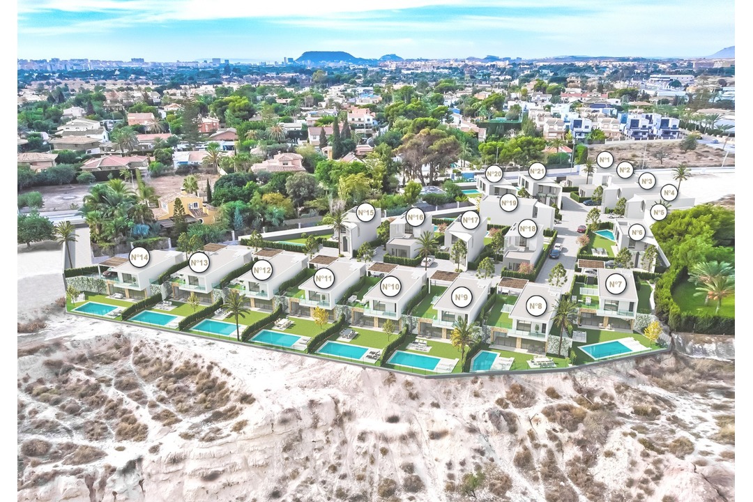 A new development of 21 independent Villas in the sought after location of San Juan (Alicante), The villas are in an exclusive private urbanization in a privileged and quiet location equipped with all types of services within reach and excellent communications with the city of Alicante, San Juan and El Campello. The stunning Muchavista Beach is just 1,200 meters from the properties. The properties include their own pool on the private plot and provide a pleasant, familiar environment with all the comforts that you have. There are three types of villas to choose from and you have the choice of a basement if required.